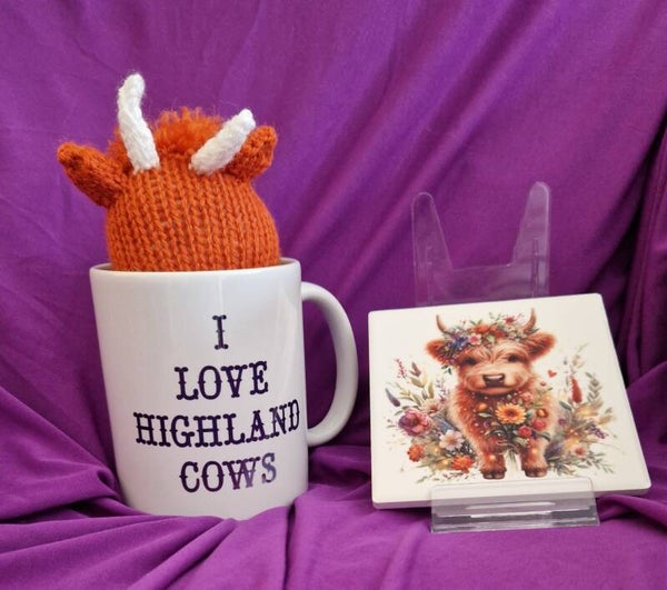 Highland Cow Mug and Coaster set with knitted Highland Cow.